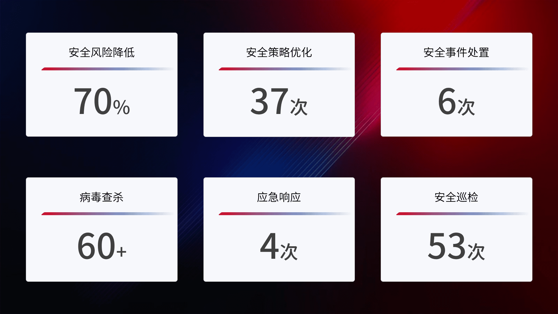 提供全面的安全事件报告体系,,包括处置报告、、周报、、季度和年度总结,,,,结合持续监控,,,,帮助客户深入了解网络安全状况。。。