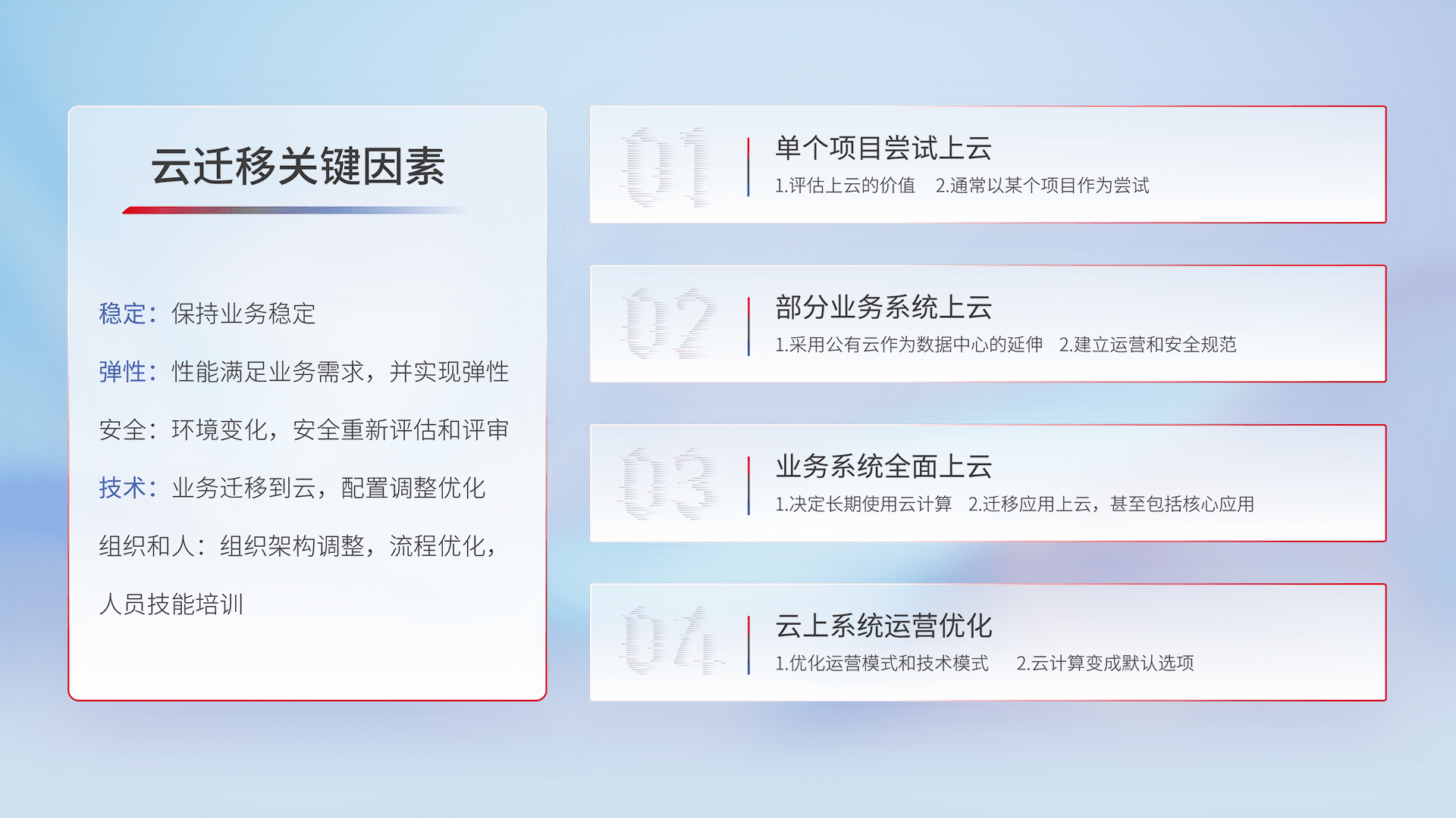 结合实际业务,,,从规划设计、、、云平台选型、、云原生改造、、、数据迁移、、、、集成交付,,迁移全过程为客户识别最佳上云路径,,,,做好风险识别管理,,,,设计网络架构、、、身份权限、、、、安全审计合规、、操作审计、、日志审计、、、、监控告警策略、、多站点容灾设计等,,,对云上基础设施进行整体规划,,,,提升IT治理水平,,以满足弹性、、高可用、、、、高性能的需求。。。。