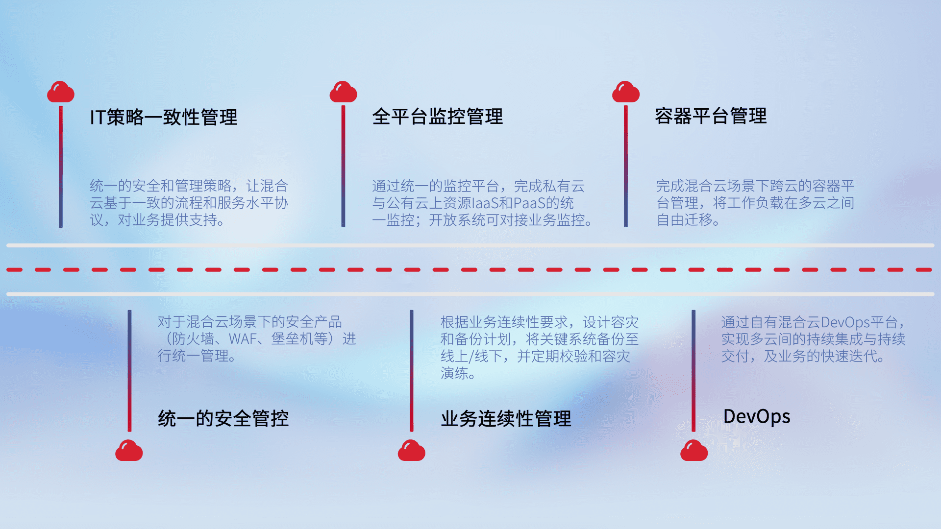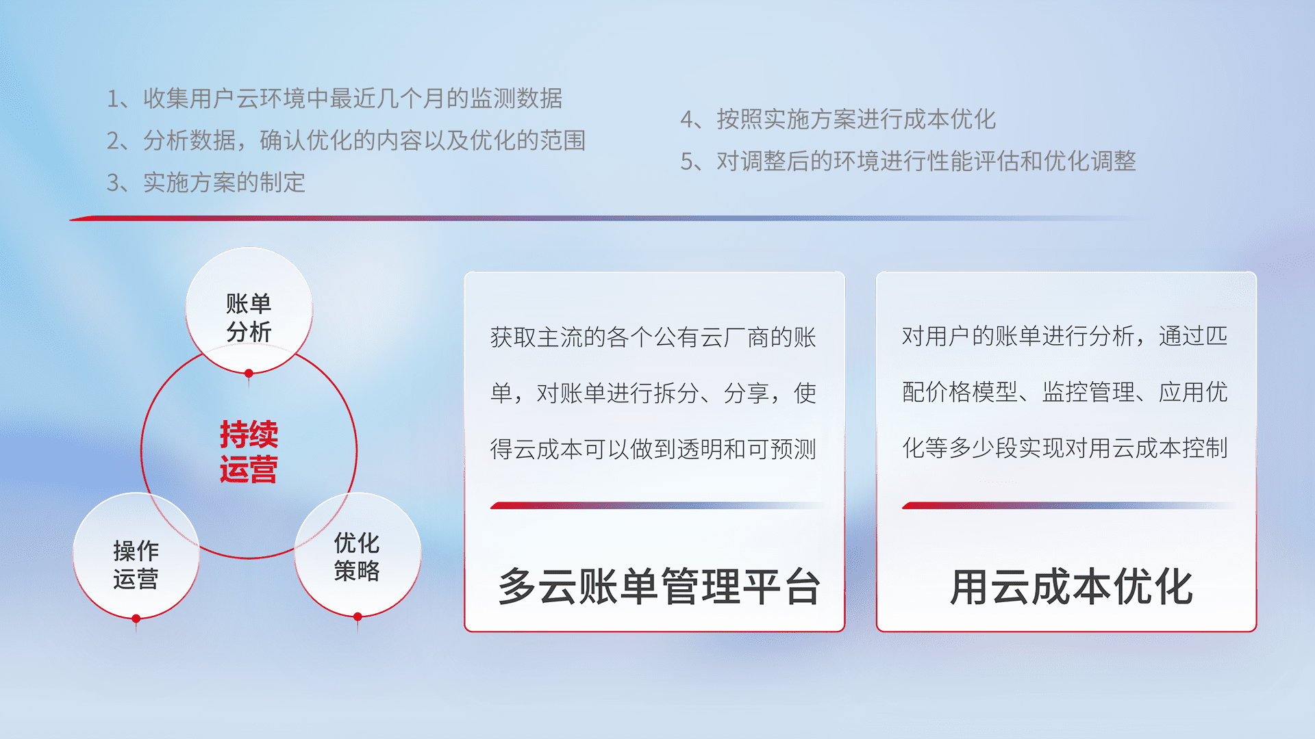 通过多云纳管,,,,以统一的资源数据模型把客户的云资源进行抽象和封装,,,,进而实现对多云资源的统一操作,,保障云资源管理的可靠性、、、、稳定性与可用性。。。量身定制化运维内容,,配置、、、、开发运维、、、、补丁管理、、、、备份、、、、监控、、、、认证和访问管理、、审计和日常巡检等,,,保障在用云过程中的可靠度,,,稳定度以及高可用率。。